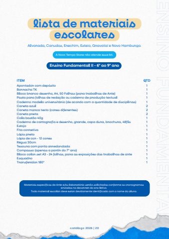 Apontador com dep%u00f3sitoBorracha TKBloco branco desenho, A4, 50 Folhas (para trabalhos de Arte)Pasta para folhas de reda%u00e7%u00e3o ou caderno de produ%u00e7%u00e3o textualCaderno modelo universit%u00e1rio (de acordo com a quantidade de disciplinas)Caneta azulCaneta marca texto (cores diferentes)Caneta pretaCola bast%u00e3o 40gCaderno de cartografia e desenho, grande, capa dura, brochura, 48flsEstojoFita corretivaL%u00e1pis pretoL%u00e1pis de cor - 12 coresR%u00e9gua 30cmTesoura com ponta arredondadaCompasso (apenas a partir do 7%u00ba ano)Bloco color set A3 - 24 folhas, para as exposi%u00e7%u00f5es dos trabalhos de arteEsquadroTransferidor 180%u00balista de materiaisescolarescat%u00e1logo 2026 | 20Alvorada, Canudos, Erechim, Esteio, Gravata%u00ed e Novo Hamburgo.ITEM QTD11111222111111111111Ensino Fundamental II - 6%u00ba ao 9%u00ba anoENSINOFUNDAMENTALIIA Novo Tempo Store n%u00e3o atende esse kit.Materiais espec%u00edficos de Arte e/ou laborat%u00f3rio ser%u00e3o solicitados conforme os cronogramasenviados no decorrer do ano letivo.Todo material escolar deve estar devidamente identificado com o nome do aluno.